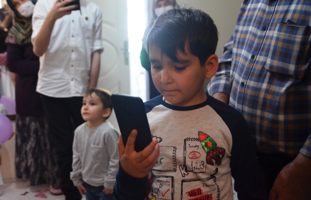 Karşısında doğum günü pastasını gören küçük çocuk, bir süre şaşkınlık yaşadı. Daha sonra pasta üzerindeki mumları üfleyen Mehmet Buğra, Demirsöz'ün telefonundan anne ve babasıyla görüntülü görüştü. Küçük kardeş Yağız Talha ile yakınlarının da katıldığı görüşmede duygulu anlar yaşandı.