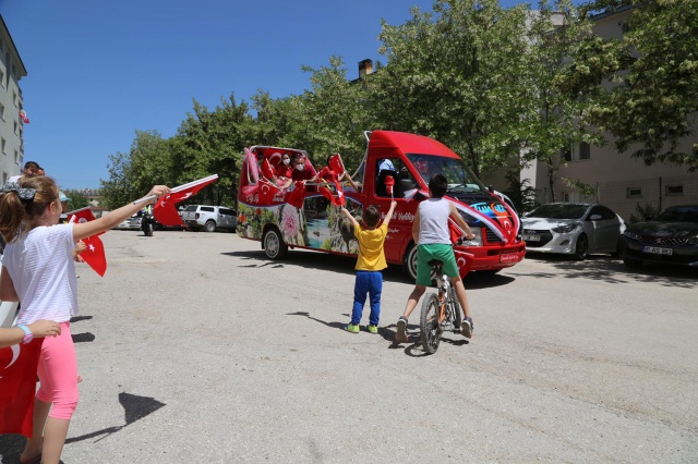 Çocuklara çeşitli hediyeler de veren Sonel, aracın üzerinden el sallayıp vatandaşlar, çocuklar ve gençlerin bayramını kutladı. Bazı çocukların bayrak almak için aracın peşinden koşması üzerine Sonel aracı durdurup tüm çocuklara bayrak dağıttı.