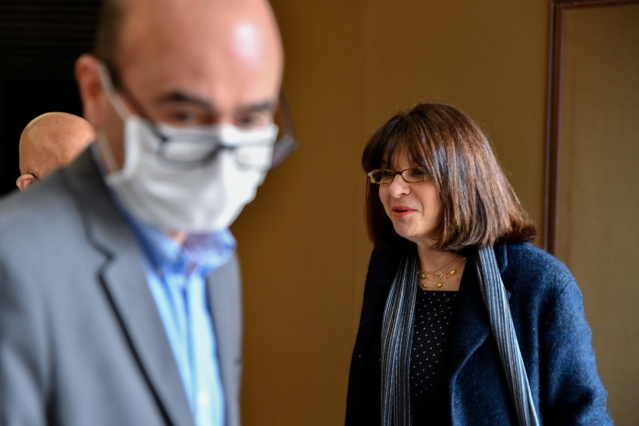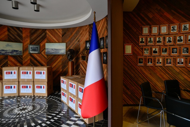 Goulet, Türkiye'nin Paris Büyükelçiliğinde, Büyükelçi İsmail Hakkı Musa'dan, Türkiye'den gönderilen 500 tıbbi elbise ve 20 bin maske teslim aldı.